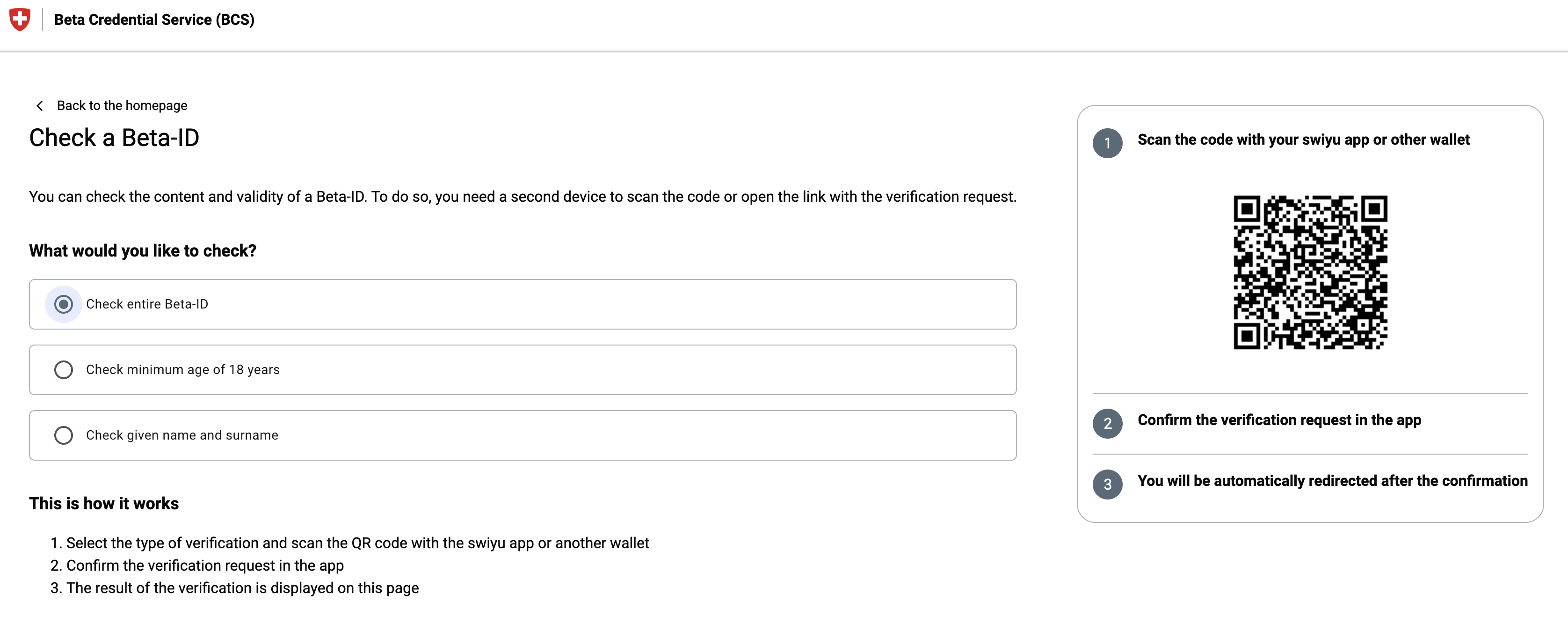 - Validate the issued credential against the Beta Credential Service (BCS) verification endpoint: https://www.bcs.admin.ch/bcs-web/#/beta-id/verification.